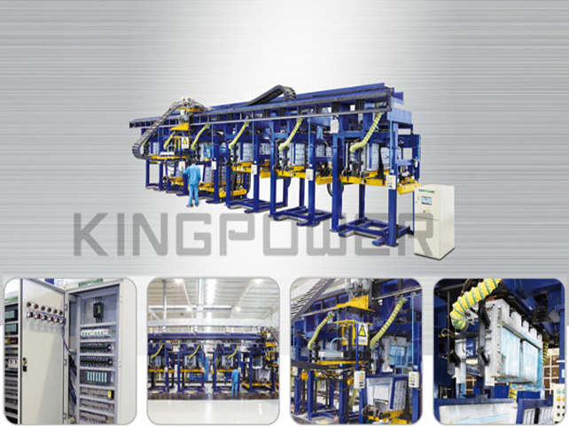 该发泡线采用直线式布局,夹具各模板采用水加热方式。夹具具有自动堵泡功能,换模采用气缸或人工驱动连杆机构,有人工控制和电气控制双重自锁功能。适用于不同长、宽、高的箱体生产。生产线具有外形美观大方、结构紧凑、环境污染少、劳动强度小、占地面积小、功能强、生产效率高、多品种柔性生产等特点。